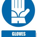 GLOVES MUST BE WORN to znak nakazu BHP informujący o obowiązku zakładania rękawic.