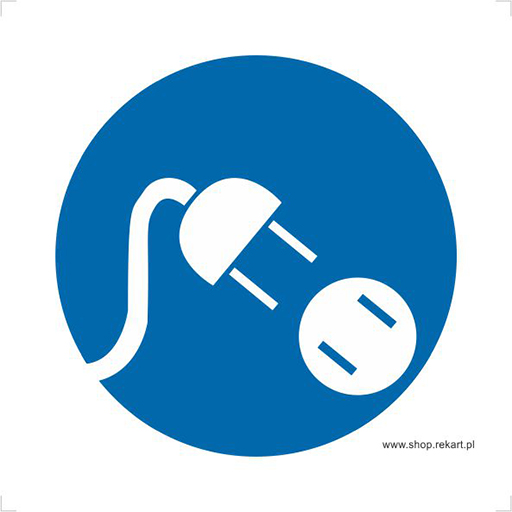 ODŁĄCZYĆ WTYCZKĘ PRZED ODSTAWIENIEM TRANSPORTERA to znak nakazu BHP informujący o obowiązku odłączenia wtyczki zasilania zanim zastąpi odstawienie transportera.