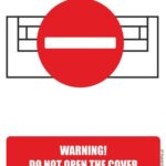 WARNING DO NOT OPEN THE COVER WHILE MACHINE IS IN OPERATION to znak zakazu BHP informujący o zakazie otwierania pokrywy w trakcie pracy maszyny w języku angielskim.